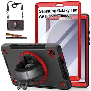 Case for Galaxy Tab A9 Plus 5G 2023: Heavy Duty TPU Cover for Samsung Tablet A9+ 11 Inch with Stand - Handle - Shoulder Strap -S-Pen Holder- Red Black