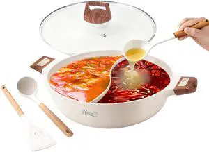 Features: Dual Flavors in One Pot - This 100% PFOA & PFAS-free divided hot pot lets you enjoy both spicy and mild broths simultaneously, catering to different taste preferences in a single meal - perfect for cutting your cooking time in half.
