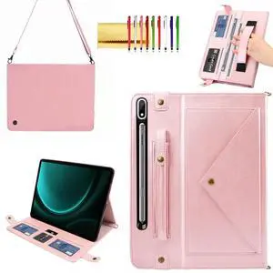 Case for Samsung Galaxy Tab S10+/S9 FE+/S9+ 12.4", Techcircle Smart Folio Stand PU Leather Cover w/Hand Strap, Crossbody Protective Case w/Pen Holder Card Slots Envelope Pocket Wallet Case, Rose Gold