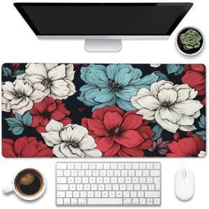 Eflxamz Desk Pad, Red White Blue Flowers Desk Mat, Manga Floral Large Gaming Mouse Pad, Extended Big Computer Keyboard Mouse Pad with Non-Slip Base and Stitched Edge, 35.4"x15.7"