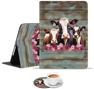 Luasao iPad 9.7 Case, Adjustable Stand Auto Wake/Sleep Smart Case for Apple iPad 6th/5th Gen/Air/Air 2/Pro 9.7 - Rustic Old Wood Art Funny Cows Combination (with Coasters)