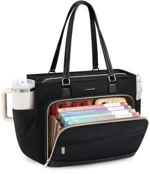 LOVEVOOK Teacher Tote Bag, 17.3 Inch Laptop Bag with Accordion File Organizer & Large Cup Holder, Professional Waterproof Black Nurse Work Tote Bag for Office & Business