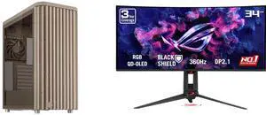 ASUS ProArt PA401 Wood Edition Beige ATX case features a tempered glass panel, supports GPUs up to 315mm, 240mm radiator, 160x32mm fans, button lock, and detachable PSU bracket ASUS ROG SWIFT 34 inch QHD 2K 1440P 360Hz AMD FreeSync Premium