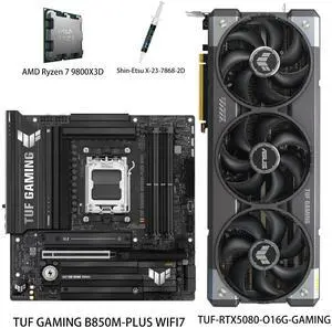 ASUS GPU& Motherboard &Thermal paste & CPU Combo, TUF-RTX5080-O16G-GAMING Graphics Card, TUF GAMING B850M-PLUS WIFI7 Motherboard, AMD Ryzen 7 9800X3D CPU, for gaming or AI pc