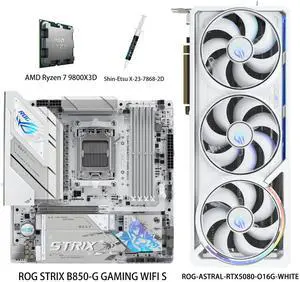 ASUS GPU& Motherboard &Thermal paste & CPU Combo, ROG-ASTRAL-RTX5080-O16G-WHITE Graphics Card, ROG STRIX B850-G GAMING WIFI S Motherboard, AMD Ryzen 7 9800X3D CPU, for Powering Advanced AI PC, gaming
