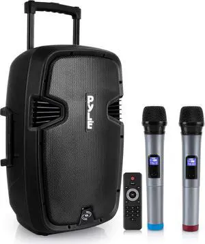 Pyle Karaoke Portable PA Speaker System - 1600W Active Powered Bluetooth Compatible Speaker, Rechargeable Battery, Easy Carry Wheels, USB MP3 RCA, FM Radio, 2 UHF Microphone, Remote - Pyle PPHP1599WU