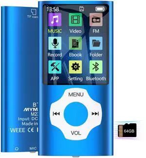 64GB MP3 Player with Bluetooth 5.2, AiMoonsa Music Player with Built-in HD Speaker, FM Radio, Voice Recorder, HiFi Sound, E-Book Function, Earphones Included