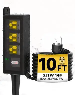 Outdoor Extension Cord, 3 Wide Outlets, 1875W/15A, 10FT 14AWG Heavy Duty SJTW Power Strip with Surge Protector, All-Weather & IP66 Waterproof, Ideal for Backyard, Patio, Garden, Pool, Garage