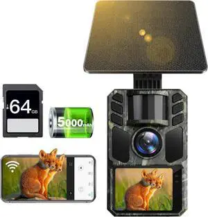 Trail Camera 4K 64MP Solar WiFi Game Hunting Camera with Night Vision Built-in 5000mAh Battery, IP67 Waterproof, Motion Activated, 64GB Memory Card
