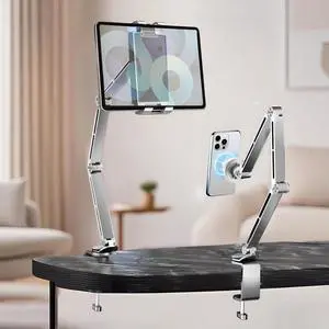 Tablet Stand for Desk, iPad Desk Mount, Magnetic Tablet Holder for Desk, Foldable Phone Arm Mount with 360° Adjustable Rotatable, Phone Holder iPad Stand Fits for 4.7-15.6" Screen (Sliver)
