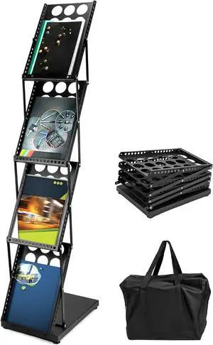 Magazine Brochure Display Rack Stand, 4 Pocket Foldable Literature Catalog Rack Book Holder Tradeshow Display Stand, for Office Store and Exhibition Trade Show (Black)