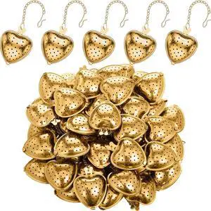 100 Pcs Tea Strainer Stainless Steel Tea Ball Infuser Loose Leaf Tea Steeper Tea Interval Diffuser Heart Shape Mesh Tea Filters with Extended Chain Hook for Seasonings Cup Bottle (Gold)