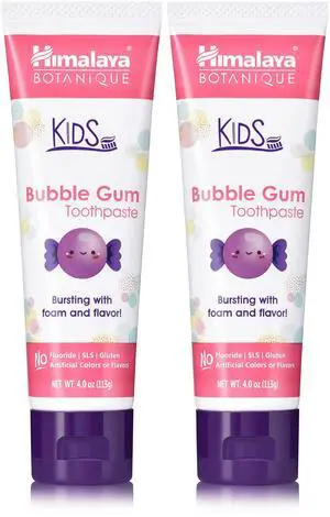 Botanique Kids Toothpaste, Herbal, Bubble Gum Flavor, Fights Plaque, Fluoride Free, Gentle, No Artificial Flavors or Colors, SLS Free, Gluten Free, Cruelty Free, Vegan, Foaming, 4 Oz, 2 Pack- Brand: Himalaya