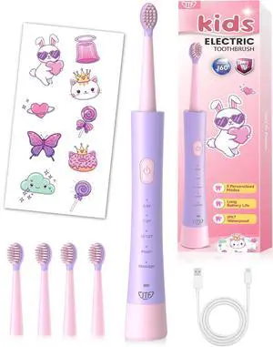 JTF Rechargeable Electric Toothbrush for Kids: 5 Gentle Modes for Ages 3+, Safe & Effective for Sensitive Teeth - with Fun DIY Stickers, 4 Soft Brush Heads, Children Sonic Toothbrush for Home & School