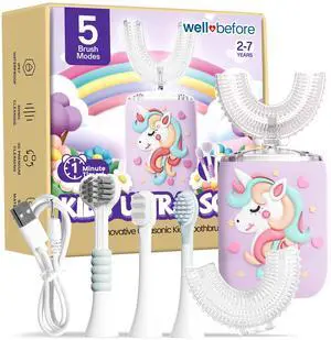 Kids U-Shaped Electric Toothbrush with 2 Brush Heads, Toddlers Sonic with 360 Degree Cleaning, Soft Bristles, Battery Included, IPX7 Waterproof, Cute cartoon for Girls and Boys, Ages 8-13 (Pink)