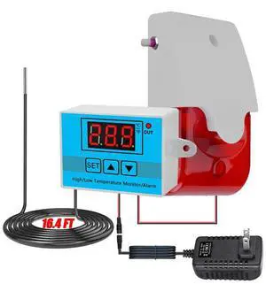 12V High/Low Temperature Monitor, Temperature Sensor with 5M Waterproof Probe, 0~120dB Adjustable Audible/Visual Freezer Alarm, Refrigerator Thermometer for Fridge/Cold Chain/RV/Pond/Farming/Factory