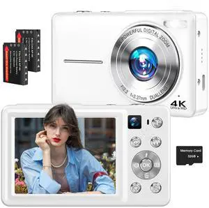 4K Digital Camera, 64MP Autofocus Vlogging Camera with Dual Lens, 16X Digital Zoom YouTube Compact Travel Point Shoot Camera for Teens Beginner, Anti-Shake,2 Batteries, 32GB Card (White)