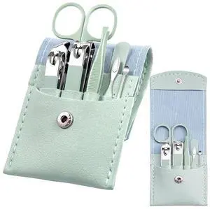 Manicure Set - 7 Pieces Professional Travel Nail Clippers with Green Leather Bag, Stainless Steel Nail Care Tools Grooming Kit for Women