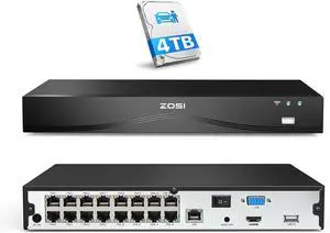 ZOSI 4K 8MP 16 Port 32CH H.265+ PoE NVR with 4TB for 24/7 Record, Supports up to 16 X 2MP/4MP/5MP/8MP ZOSI PoE IP Cameras, 2 SATA Ports up to 8TB for Extended Recording, Remote Access, Motion Detect