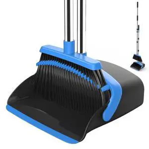 Dustpan Broom Set with Adjustable Long Handle, Easy to Assemble, Blue and White