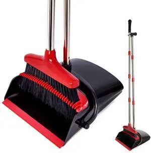 Broom and Dustpan Set with Long Handle, Light Weight Stainless Steel Poles Stand Upright Dustpans with Broom Combo for Home Kitchen Office Pet Dog Hair, Black & Red Color, 1-Pack