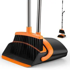 Broom and Dustpan Set, 55-in Long Adjustable Handle Broom with Dustpan Combo Set with Dustpans Teeth to Automatically Clean Hair Suitable for Home Kitchen Office Hall Lobby, Large(Black&Orange)
