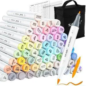Alcohol Markers Brush Tip - 61 Pastel Brush & Fine Dual Tip Art Markers for Artist Illustration, Adult Coloring Books, Gifts for Artist Adult, Colorless Blender, Enjoy Blending, Carrying Case