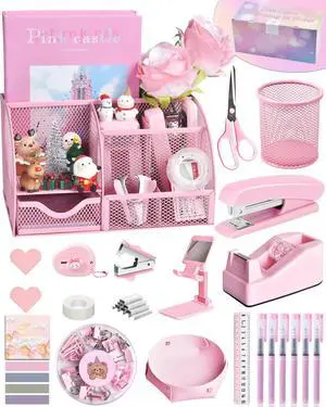 Pink Desk Accessories, 24Pcs Pink Office Supplies and Desk Organizers, with Tape Dispenser, Stapler, Staple Remover, Ect, Gift Box Packaging