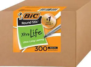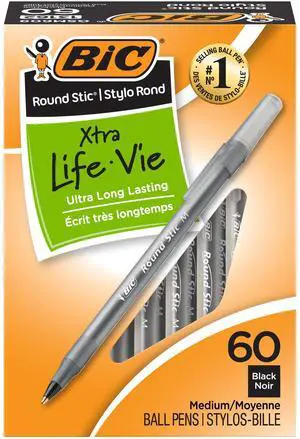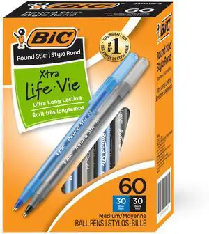 Round Stic Xtra Life Pens, Medium Point 1.0 mm, 30 Black & 30 Blue Ink Pens, Pack of 60