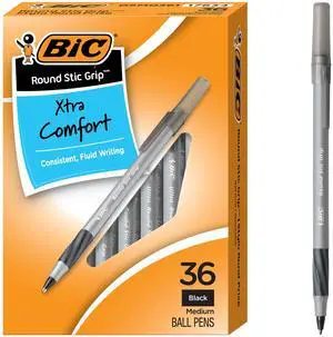 Round Stic Grip Xtra Comfort Black Ballpoint Pens, Medium Point (1.2mm), 36-Count Pack, Perfect Writing Pens With Soft Grip for Superb Comfort and Control