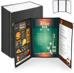 WeChef 30 Pack Menu Cover 8.5 x 14" 6 View Triple Fold Double Stitch Trim Cafe Restaurant Black