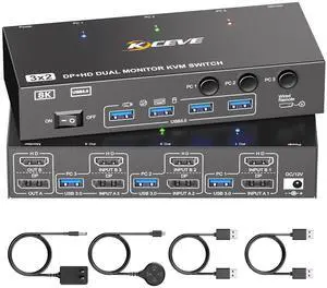 HDMI+Displayport KVM Switch 2 Monitors 2 Computers 8K@60HZ Dual Monitors KVM Switcher for 2 PC/Laptops Share Mouse Keyboard and 2 Screens,with USB3.0 Ports/Wired Controller EDID Adapative