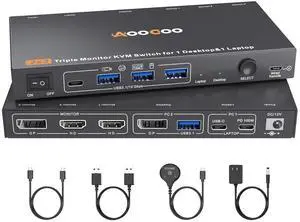 USB C DP KVM Switch 2 Computers 3 Monitors,4K/1080P@60Hz MST KVM Switch for 1 PC&1 Laptop Share 3 Monitor with 4 USB3.0 Devices,PD for Laptop, USB Cables and Power Adapter(4K USB C DP 2 in 3 Out KVM)