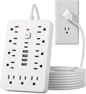 15 FT Flat Plug Surge Protector Power Strip,11 Multiple AC Outlets with 6 USB Ports (2 USB C), 15 Feet Extension Cord, 1250W/10A, One Touch Switch Button, White