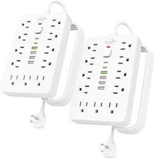 20 FT Flat Plug Surge Protector Power Strip,11 Multiple AC Outlets with 6 USB Ports (2 USB C), 20 Feet Extension Cord, 1250W/10A, One Touch Switch Button, White