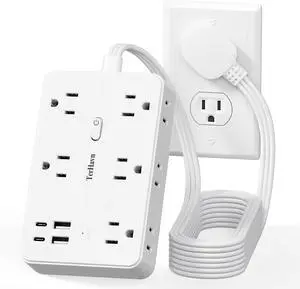 Surge Protector Power Strip, Flat Extension Cord with 9 Widely Outlets 3 USB Ports(1 USB-C), 1080 Joules, 5 FT, Multiple Outlets, Wall Mount, Flat Plug for Indoor Home Office, Dorm Essentials, White