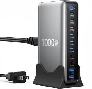 1000W 10-Port GaN 4 Desktop Charging Station with 240W 6.6 ft Data Cable - Compatible with Tablets Phones Laptops Gaming Consoles Headphones
