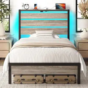 Rolanstar Twin Bed Frame with LED Lights and Charging Station, Wood Storage Headboard and Under Bed Storage, Metal Platform Bed, Easy Assembly, No Box Spring Needed, Grey