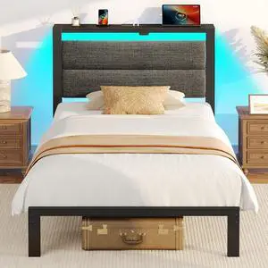 Rolanstar Bed Frame Twin Size with Charging Station, LED Twin Bed Frame with Upholstered Storage Headboard, Platform Bed with Metal Slats & Under Bed Storage, No Box Spring Needed, Noise Free, Grey