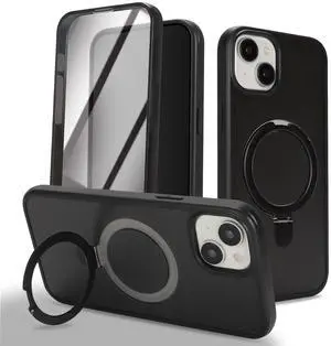 for iPhone 15 Case with Magnetic Ring Stand and Built-in Screen Protector,360 Full Body case with MagSafe,for Apple iPhone 15 Protective Phone Cases for Men Women Gril-Black