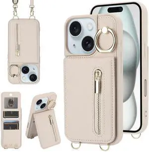 Crossbody Wallet Case for iPhone 13/14, with Card Slots Zipper Pocket Case, Flip Folio Purse RFID Blocking with Ring Kickstand Detachable Strap-Beige