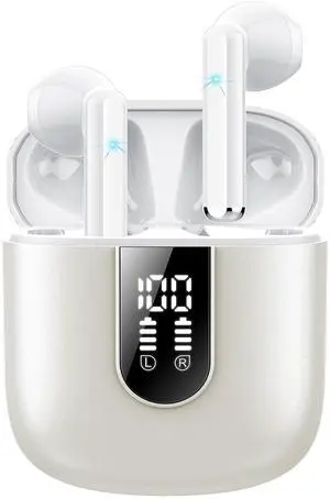 JAYSUING Wireless Earbuds, Bluetooth 5.4 Headphones HiFi Stereo, Bluetooth Earbuds with ENC Noise Cancelling Mic, 36H LED Display Ear Buds, IPX7 in Ear Earphones for Phone Tablet Laptop Sports, White