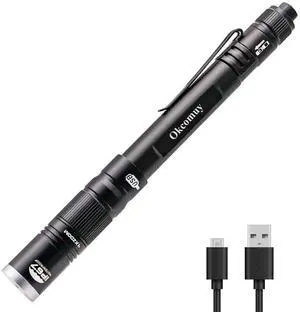 Specifications: Waterproof, Adjustable Light Modes, Rechargeable, Non Slip Grip, 5.5 hours, Aluminum, lithium, 3 L x 3 W x 17 H centimeters, 2.06 ounces, waterproof, 2 year warranty., okcomuy, rechargeable pen light