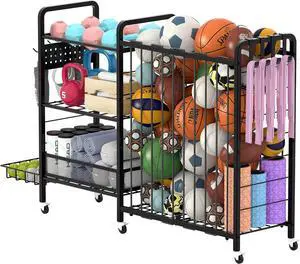 Sports Equipment Garage Organizer,Garage Ball Storage Rack for Sports with Wheels-Upgraded 3 Layers Organizer Rack Outdoor Basketball Racks for Balls with Holder and Hooks (Deep Black)