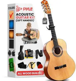 Pyle Left Handed Beginner Acoustic Guitar Kit, 1/4 Junior Size All Wood Build Nylon Stringed Instrument with Capo, Strap, Extra String Set, Gig Bag, Guitars for Beginners Adults Youth, 30" Natural