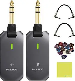 NUX Guitar Wireless System (C-5RC 5.8GHz) for Active/Passive Pickup Guitar with Charging Case Bundle with 2x Strukture S6P48 Woven Right Angle Patch Cables, 12x Fender Guitar Picks & Polishing Cloth
