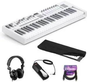 Novation Launchkey 49 MK4 USB MIDI Keyboard Controller (White, 49 Keys) Bundle with Closed-Back Studio Monitor Headphones, Keyboard Dust Cover, MIDI Cable 10' and FP-P1L Universal Sustain Pedal