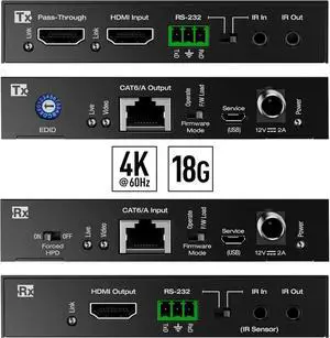 KD-X444LP-A: HDMI over 70m CAT6 Extender Set, with 4K 18Gbps bandwidth, HDR, HDCP 2.2, HDR, extends 4K 18Gbps and 1080p HDMI signals up to 230ft / 70m