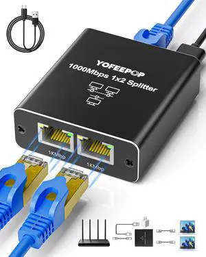 Gigabit Ethernet Splitter 1 to 2, LAN Cable Splitters High Speed 1000Mbps RJ45 Ethernet Switch with USB C Power Cable for Cat5/5e/6/7/8 Cable