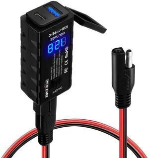 Motorcycle USB Charger SAE to USB Adapter Type C and Quick Charge USB 3.0 with Voltmeter, ON/Off Switch and 3.6FT SAE Extension Cable Waterproof 3 Install Options for GPS Smartphone Camera